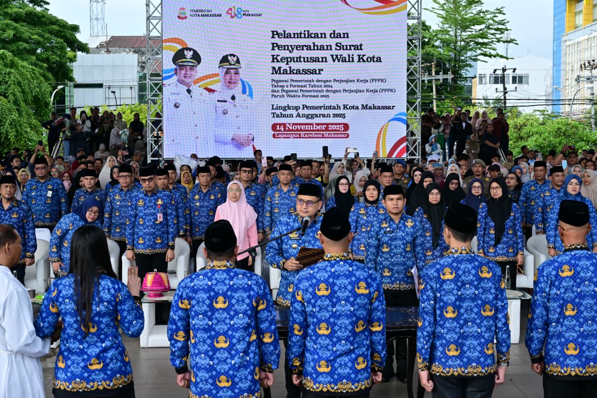 Penakaminews, MAKASSAR – Wali Kota Makassar, Munafri Arifuddin, memimpin Upacara Pelantikan dan Penyerahan Surat Keputusan Pengangkatan Pegawai Pemerintah dengan Perjanjian Kerja (PPPK) Tahun 2024 dan PPPK Paruh Waktu Tahun 2025 di Lapangan Karebosi, Jumat (14/11/2025).